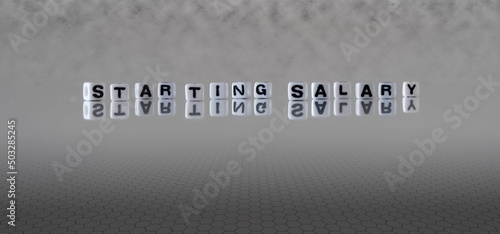starting salary word or concept represented by black and white letter cubes on a grey horizon background stretching to infinity