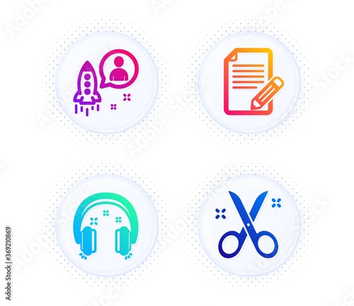 Startup, Article and Headphones icons simple set. Button with halftone dots. Scissors sign. Developer, Feedback, Earphones. Cutting tool. Education set. Gradient flat startup icon. Vector