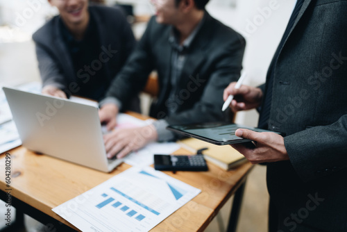 startup business, business advisor explaining strategy for planning finance investment teamwork paperwork audit and discussing marketing, profit, budget of company in meeting room.