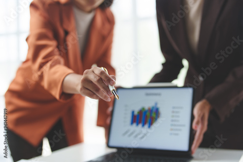 Startup business idea Businesswoman, management team, administration, pointing at chart on laptop and explaining strategy Discuss with the team to analyze financial business growth.