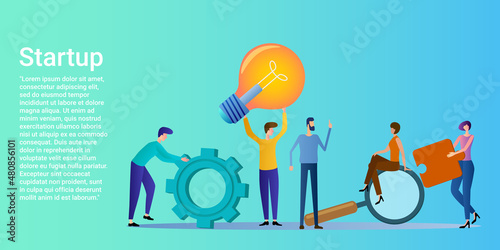 Startup.People with a light bulb and puzzles in their hands.The concept of brainstorming.Poster in business style.Flat vector illustration.