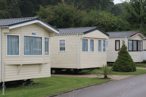 Static caravans lined up on a grassy campsite with trees in the background.