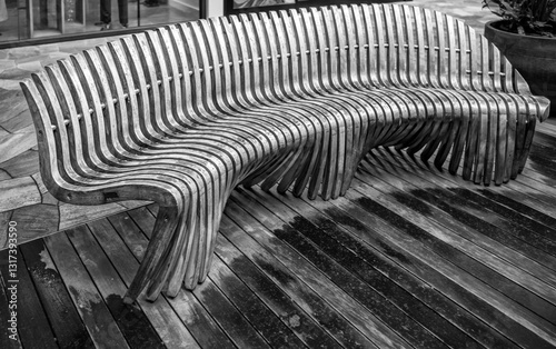 Steam Formed Wooden Bench on Wet Wooden Flooring for an Abstract Background in Black and White.
