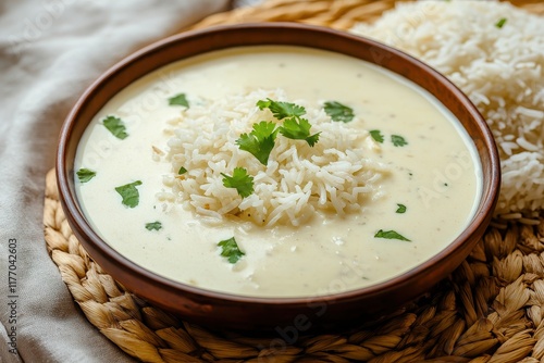 Steamed rice served with yogurt-based kadhi garnished with fresh coriander leaves.