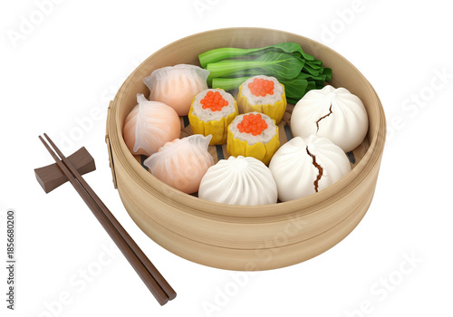 Steaming Bamboo Basket Filled With Delicious Assorted Dim Sum Dumplings