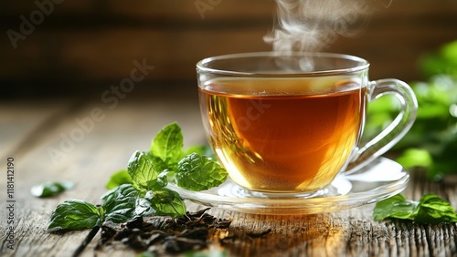 Steaming cup of herbal tea surrounded by fresh mint leaves