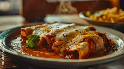 Steaming enchiladas with melted cheese and cilantro on a rustic plate
