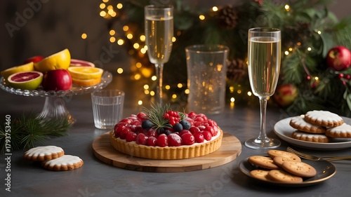 Steaming hot homemade Christmas pie, fresh from the oven, cooling on a rack. Festive holiday decorations, warm candlelight, and seasonal cheer create a cozy yuletide atmosphere, perfect for winter