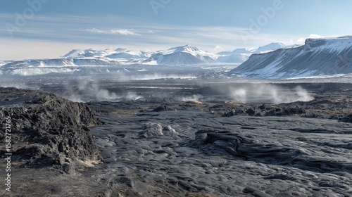 Steaming lava field meets snow capped mountains under a clear blue sky