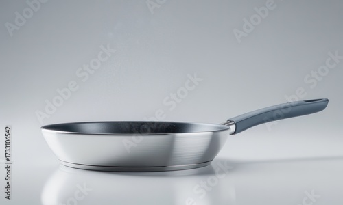 Steel frying pan, gray handle, shallow depth of field, against white backdrop