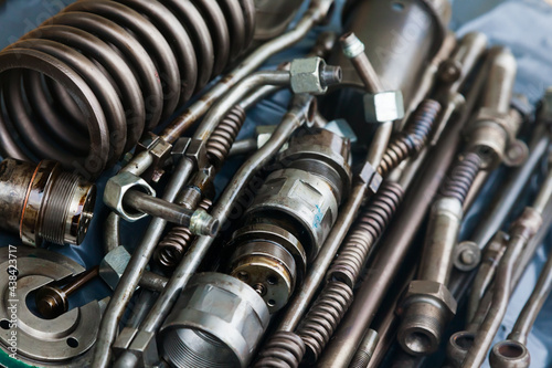Steel mechanical parts smeared with machine oil, close-up. Steel nozzles, springs, studs, couplings and tubes.
