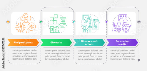 Step to evaluate website usability rectangle infographic template. Data visualization with 4 steps. Editable timeline info chart. Workflow layout with line icons. Myriad Pro-Bold, Regular fonts used