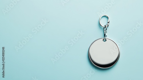 Sterling silver pet tag on light blue background, top view. Plenty of space for text.