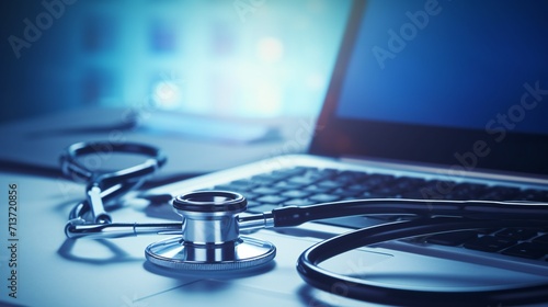 Stethoscope and pen on clipboard with keyboard on blue background. Medical concept