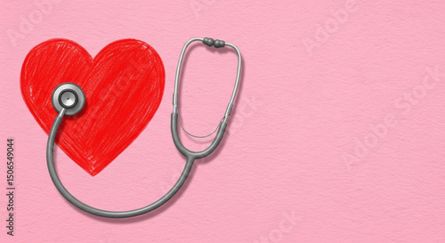 Stethoscope resting on drawn heart shape on pink background