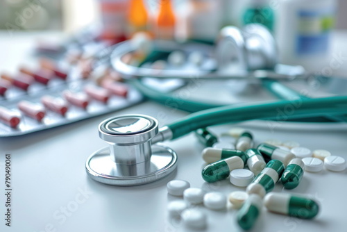 stethoscope with pile on white table with capsule pills, equipment