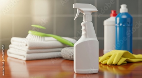 Still life of cleaning supplies, including spray bottle, towels, brush, and gloves