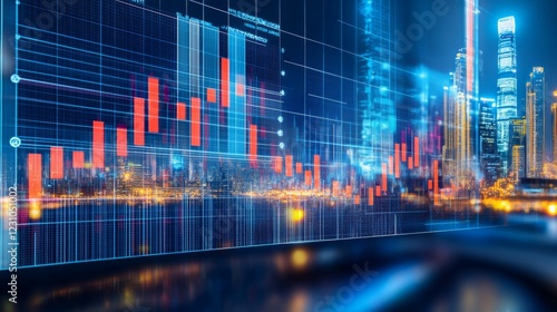 Stock Market Data Overlay on Cityscape at Night