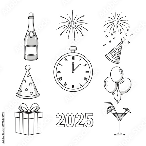 Stock vector illustration of a vintage champagne bottle and glass for a New Year celebration party