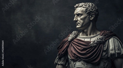 Stone bust, Roman emperor, draped toga, serious gaze.