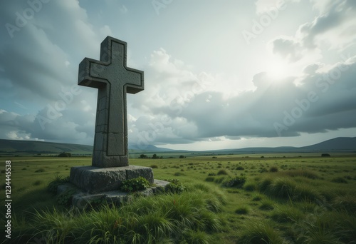 Stone cross in grassy field under cloudy sky.