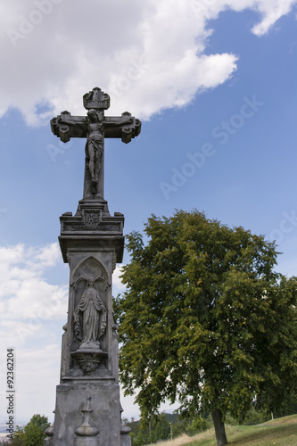 stone cross with Jesus and tree in the background