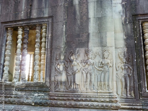 Stone relief of Apsara in temple of Angkor Wat with morning sun, ruins of Angkor, Cambodia