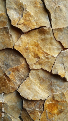 Stone wall featuring irregularly-shaped, tan-colored rocks stacked together tightly
