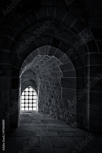 Stone wall with one backlit window with iron grid at one of the passages of an old citadel, Alexandria, Egypt. A fifteenth century defensive fortress located on the Mediterranean sea coast