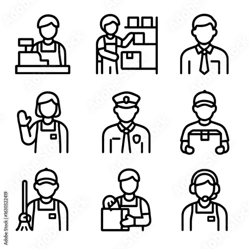 Store Staff Icons. Outline icon set of store staff and roles: cashier, shelf stocker, store manager, greeter, security guard,
