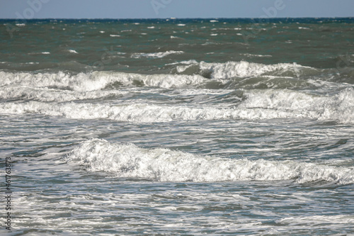 Storm at sea. Foamy water. Waves at sea. Seascape in autumn. Ocean from the side of the coast.