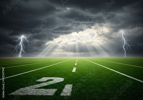 Stormy Football Field: Lightning Strikes Over Green Turf with Marked Lines and Sun Rays Breaking Through Dark Clouds for Dramatic Effect