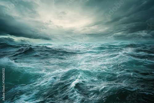 Stormy ocean waves clash under dark, dramatic skies at dusk