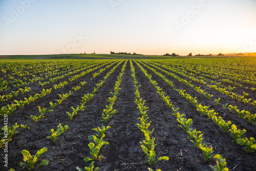 Straight rows of sugar beets grows on the farmer's field in spring. Agriculture, organic.