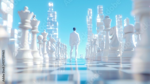 Strategic Choices 3D Character on Digital Chessboard with Cinematic Lighting Contemplating Next Move