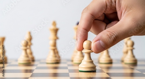 Strategic hand moves pawn forward on a chess board, symbolizing thoughtful planning and competition.