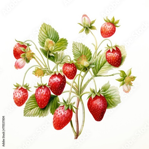 Strawberry branches painted with watercolor on white background