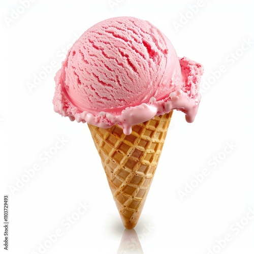 Strawberry ice cream melting on a cone on a white background