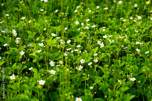 Strawberry plant. Blossoming of strawberry. Wild stawberry bushes. Strawberries in growth at garden. Organic farming concept.