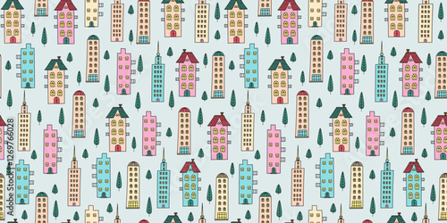 Street, city seamless pattern. Cute colorful old houses. Drawing, doodle. Architecture, construction. Hand drawn cartoon city, trees. Repeating background for decor textiles, wallpaper.