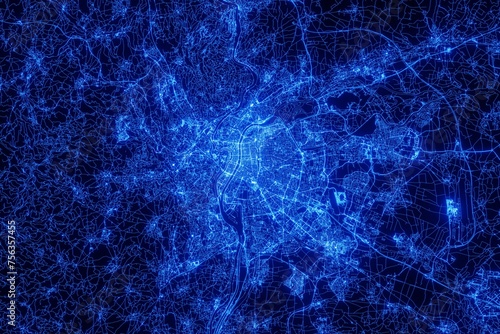 Street map of Lyon (France) made with blue illumination and glow effect. Top view on roads network