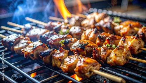 Street Vendor Cooking Yakitori Skewers. Traditional Japanese Food