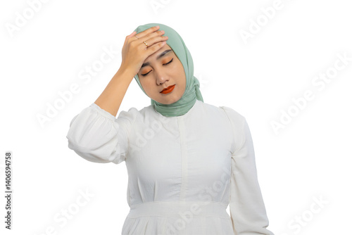 Stressed young Asian woman in green hijab and white blouse touching her forehead in frustration isolated on transparent background