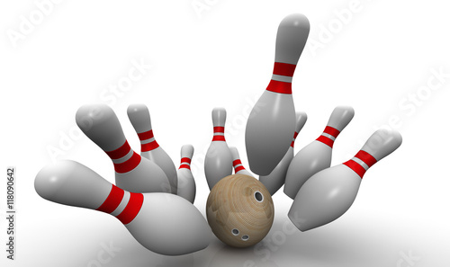 Strike. Bowling ball knocks down all the pins. Bowling ball and skittles are on the white surface. Isolated. 3D Illustration