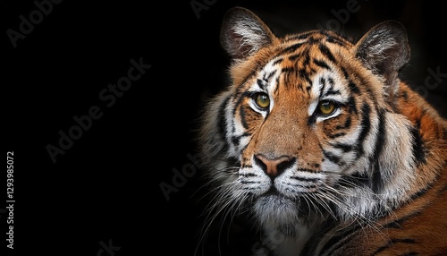 Striking Black Background Tiger, Majestic Feline Captured in High Contrast with Intense Gaze and Sleek Fur, Evoking Power and Grace.