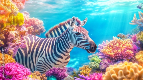 Striped zebra swimming underwater surrounded by brightly colored coral reef. Surreal fantasy animal in vibrant marine environment. Wildlife diversity concept