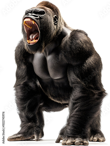 Strong gorilla standing and roaring isolated on white background