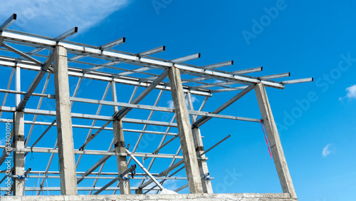Structure of house second floor. Structure of pole from concrete and structure of roof made from steels. under blue sky and white clouds.