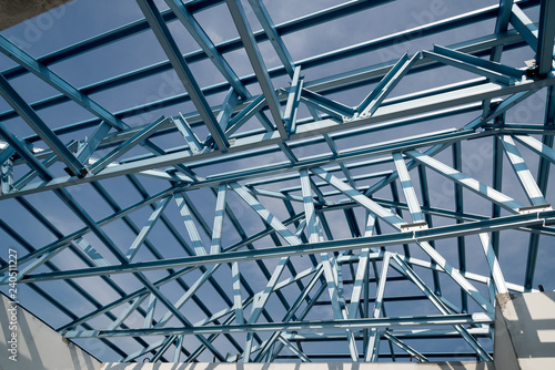 Structure of steel roof frame for building construction.