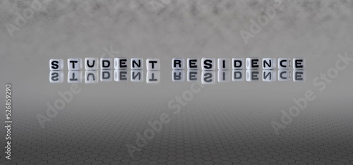 student residence word or concept represented by black and white letter cubes on a grey horizon background stretching to infinity